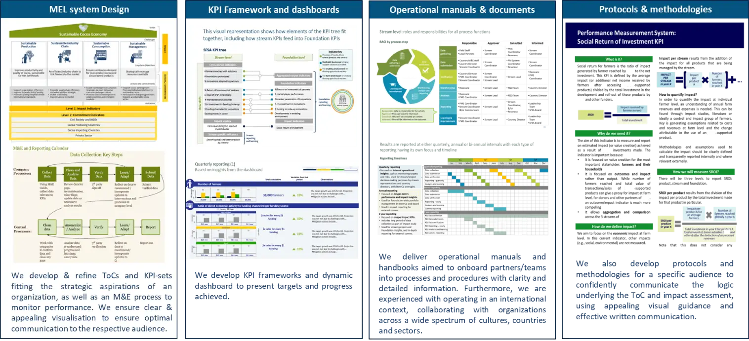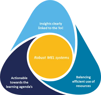Increasingly there is a need to report on impact and outcomes rather than solely on activities and outputs. We believe that strong impact measurement is key to informing strategic considerations. An organizational Theory of Change should be well-developed and understood to align the MEL system to its objectives.