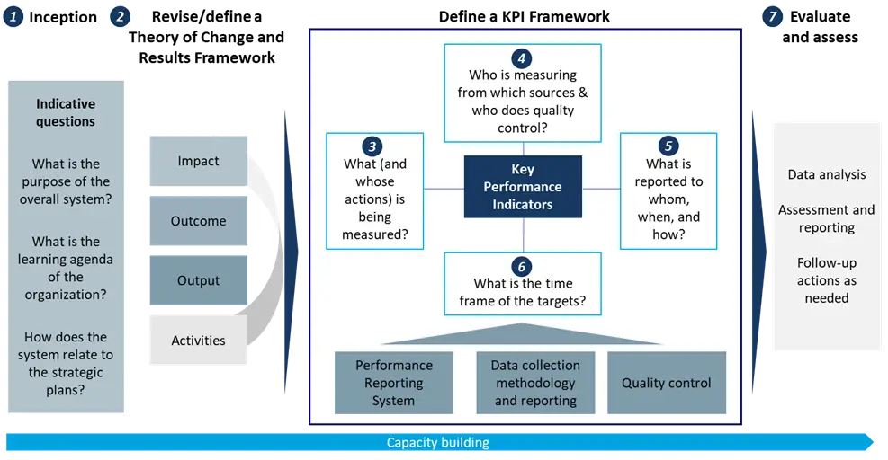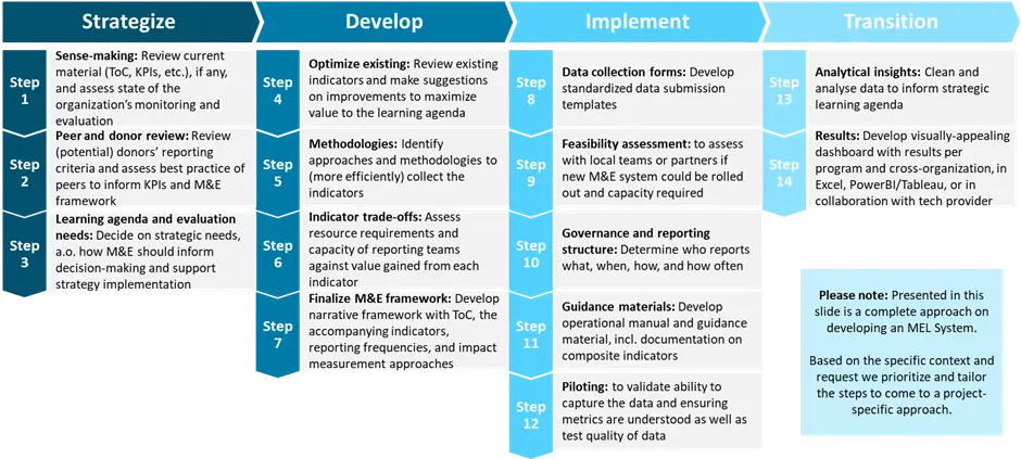 A robust MEL system needs to have the right building blocks and infrastructure in place. Building a MEL system consists of a series of steps with key elements that need to be considered and reflected upon when developing the system and operationalizing it. It also needs to be accompanied by continual capacity development, for instance on data collection, analytics reporting, and quality, etc.